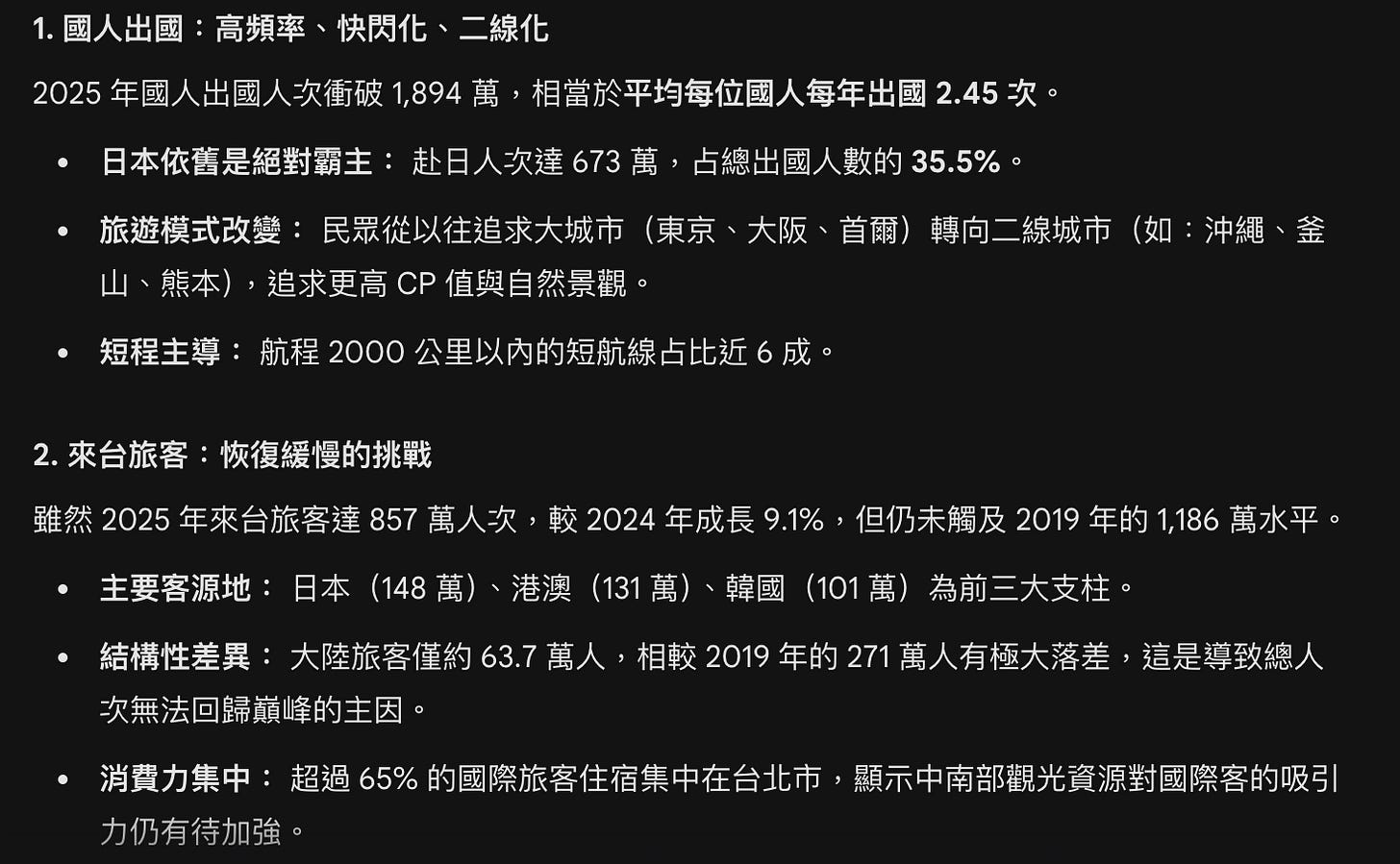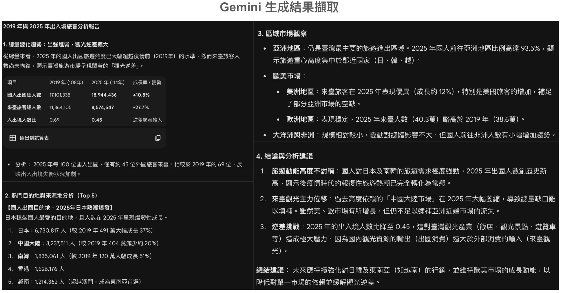 看完跑出來的結果後,覺得AI真的能扮演八成基礎資料分析的角色。我給予的目標只有比對兩年的數據,但AI可以自己解讀原始資料、計算差異、成長幅度,也能從總量變化、出國旅客分析、來台旅客分析最後做總結的內容寫得非常完整。