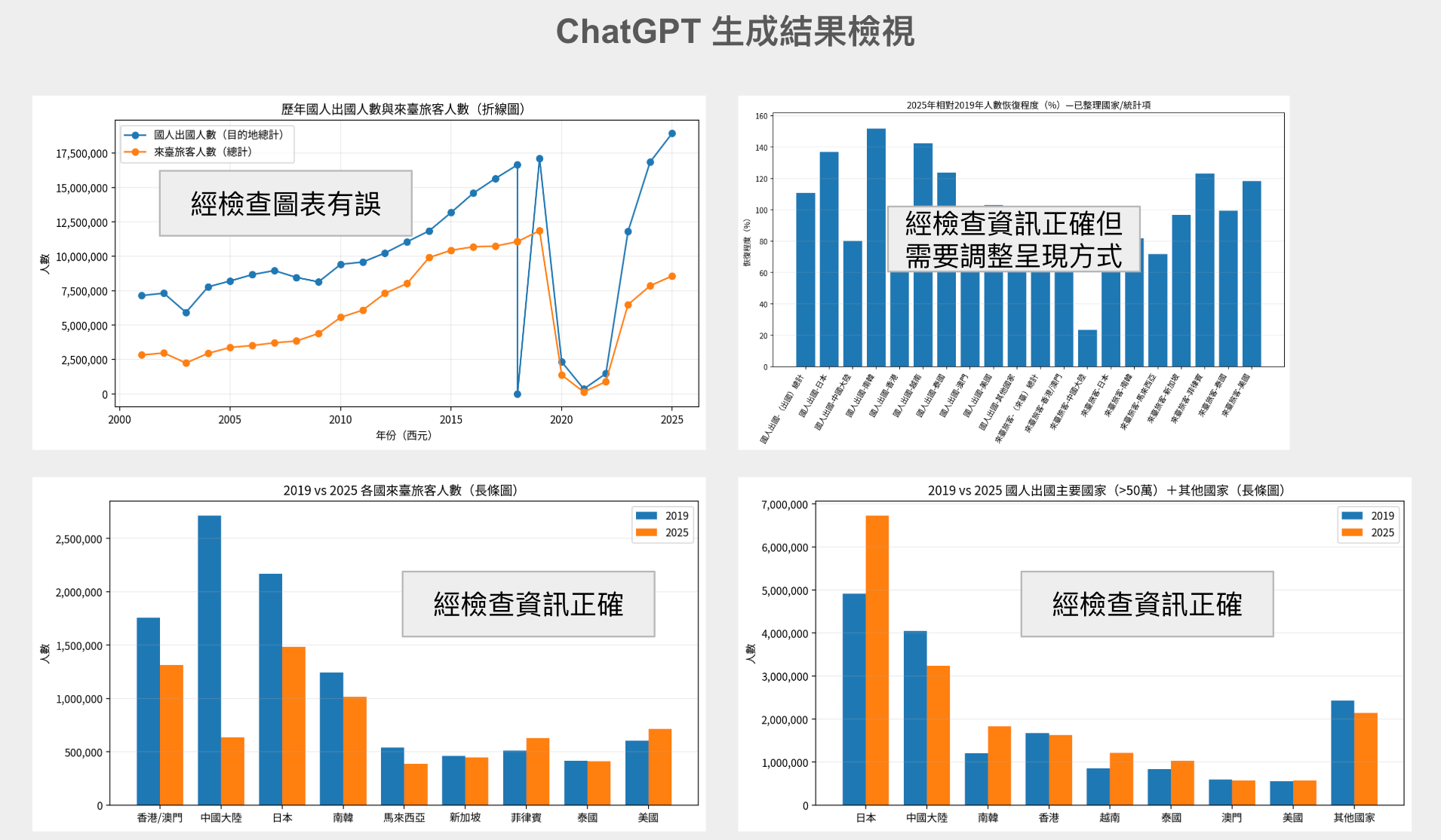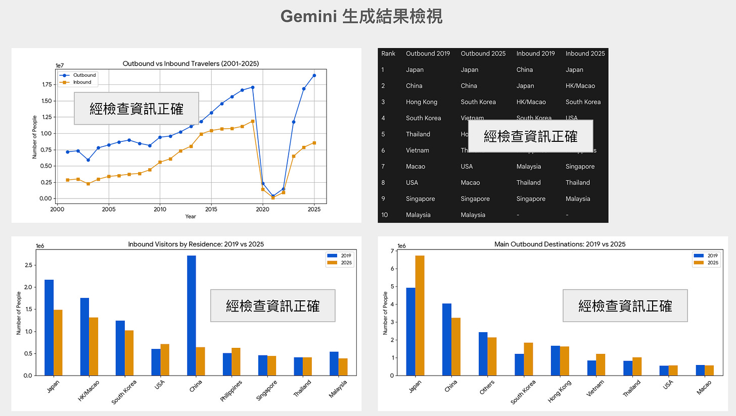 此篇是延續前篇 數據觀察:2025年臺灣出國與來臺觀光人數比疫情前恢復多少?,在自己手把手完成內容後,想測試目前的AI工具可以做到什麼程度做之紀錄。