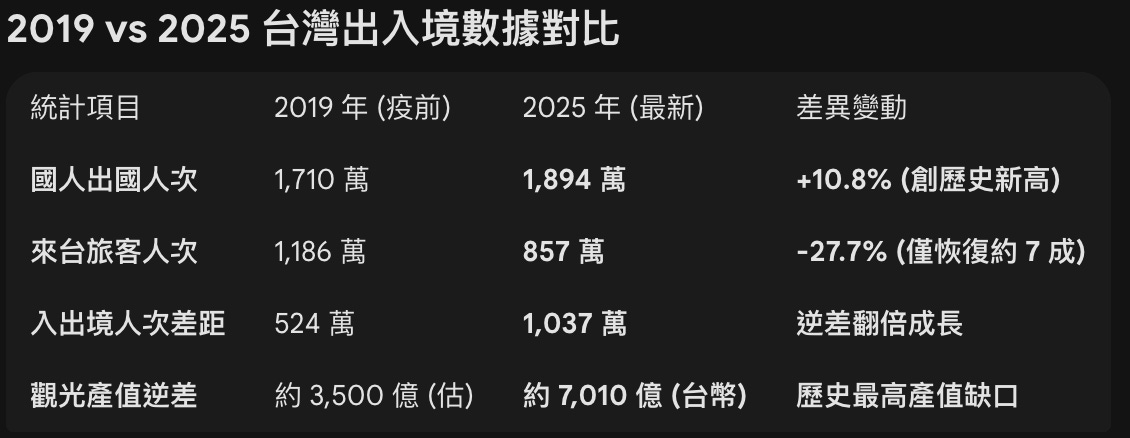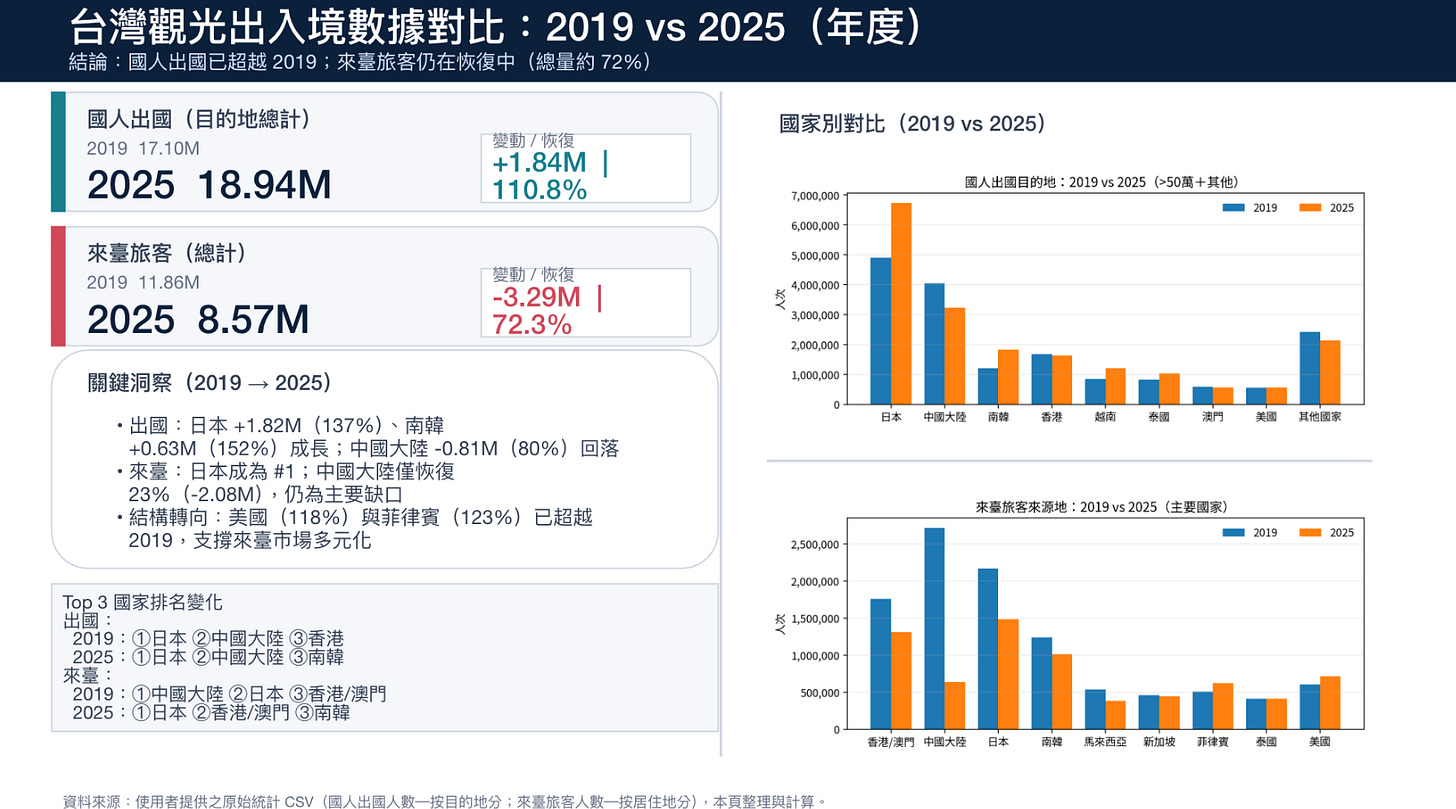 我想要請你做一份有關臺灣國人出國及來臺旅客的數據分析資料,重點放在2019及2025年的數據差異。