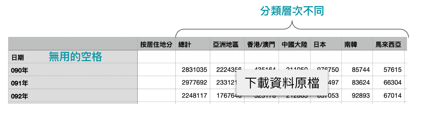 例如刪除無用的空格、將人數總和與個別國家資料分成兩張表、將民國年轉為西元年等。